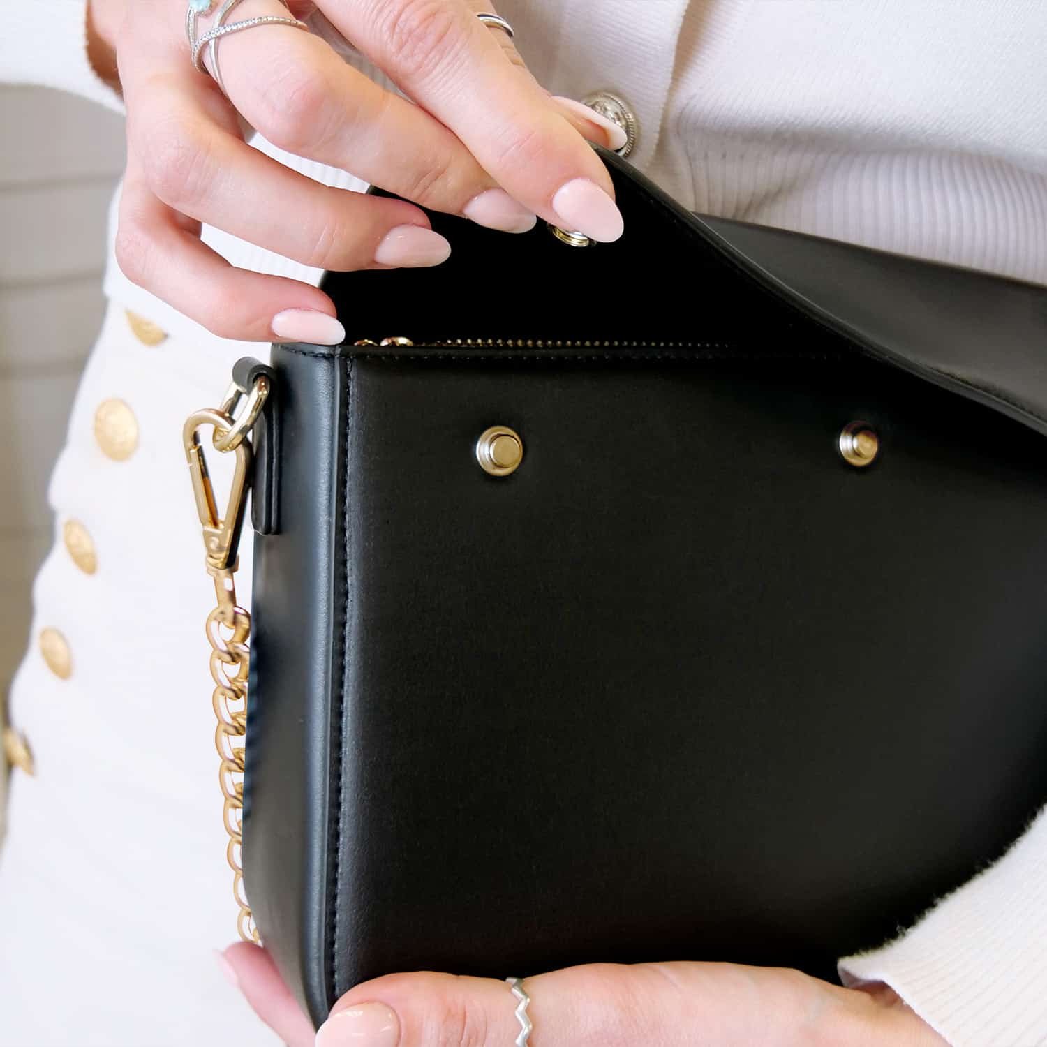 Unser System austauschbarer Accessoires ermöglicht es Ihnen, die Klappe Ihrer Tasche in wenigen Sekunden dank drei Druckknöpfen leicht zu wechseln.